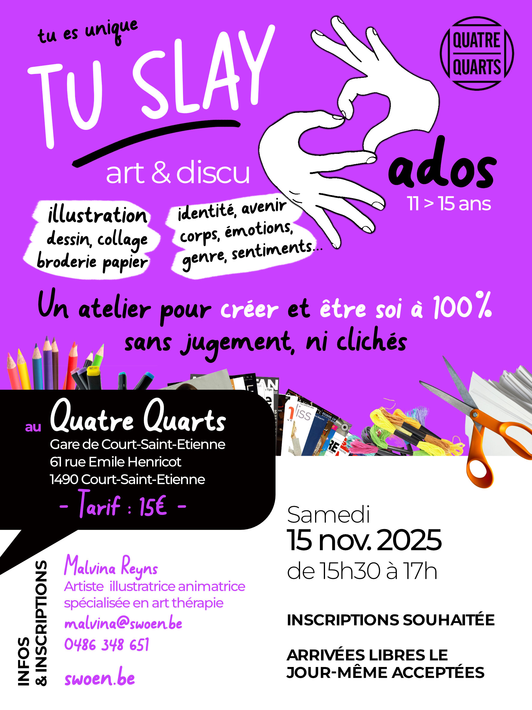 Un moment créatif et bienveillant, pensé pour les jeunes ados. Un espace intime et safe où les discussions choisies seront encadrées par l’animatrice, qui est spécialisée en art-thérapie, dans un objectif de valorisation et de confiance en soi.  Ce sera un atelier cocon dans le confort du salon.